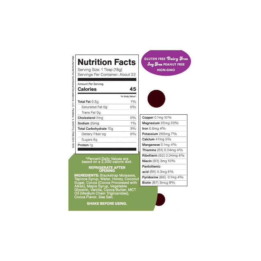 Active Ingredients: Blackstrap Molasses, Tapioca Syrup, Water, Honey, Coconut Sap, Cocoa (Cocoa Processed with Alkali), Maple Syrup, Vegetable Glycerin, Vanilla, Cocoa Butter, MCT Oil (Medium Chain Triglicerides), Natural Flavors, Sea Salt.